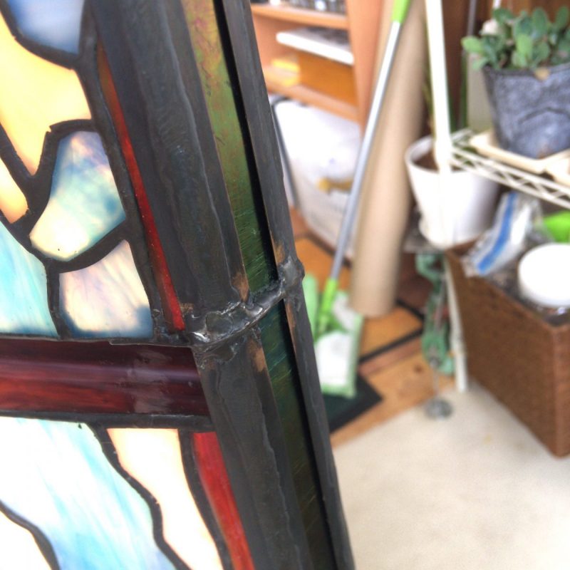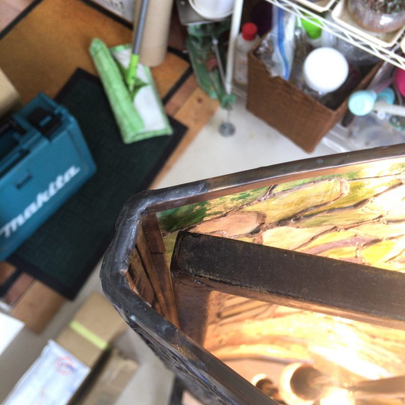 2019年10月19日 / 最終更新日時 : 2020年1月18日 okno 修理 リバーシブルのパネルの修理 両面絵柄のステンドグラスの行灯の両サイドが剥がれてしまって隙間が空きガラスも取れてしまっているということで修理依頼がありました。 ガラスを嵌め直し針金で補強し、何箇所が割れてしまった部分はハンダで割れを隠し修理完了いたしました!
