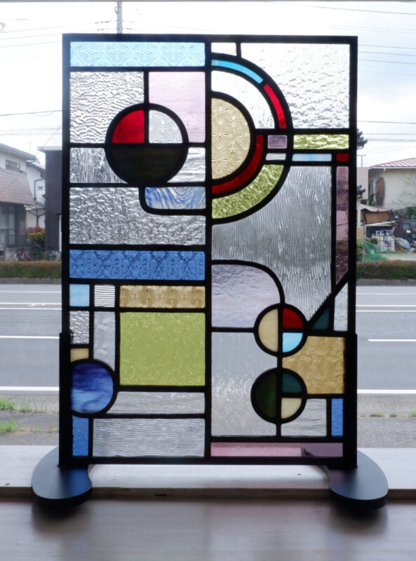 生徒さんの作品。レトロなデザインのステンドグラスパネル