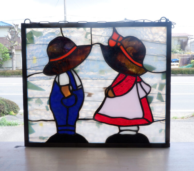 生徒さんの作品。ステンドグラスの男の子と女の子のパネル