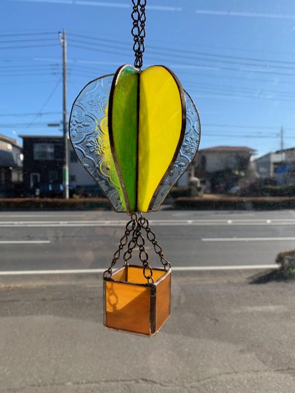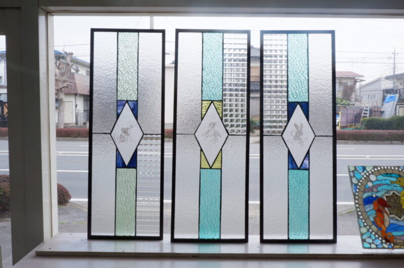 生徒さんの作品。3枚のステンドグラスパネル(サンドブラスト )