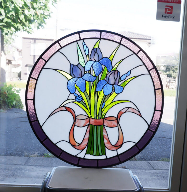 生徒さんの作品。花束の円形ステンドグラス