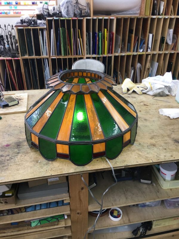 割れた箇所8ピースくらいのガラス交換と一部ガラスの色を変えてほしいということで下の部分に赤いガラスを一周ぐるっと入れました。