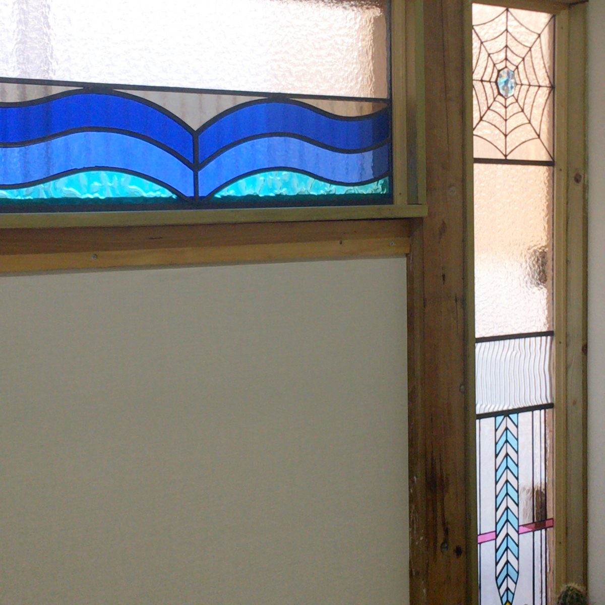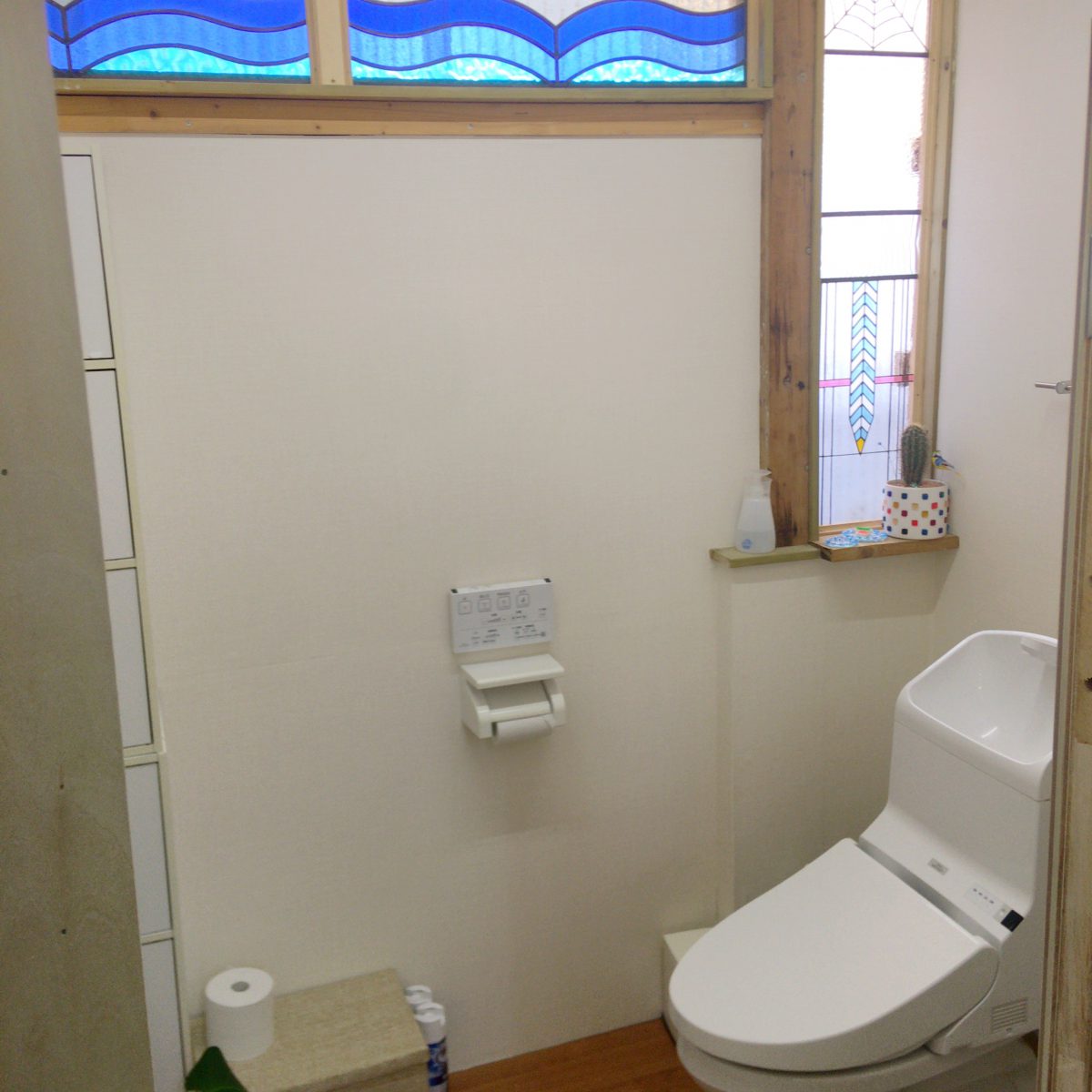 今まで工房のトイレの窓はポリカの波板だったのですが、隙間風が入ってきて寒いので内側に余ってるガラスやステンドグラスを取り付けてみました。