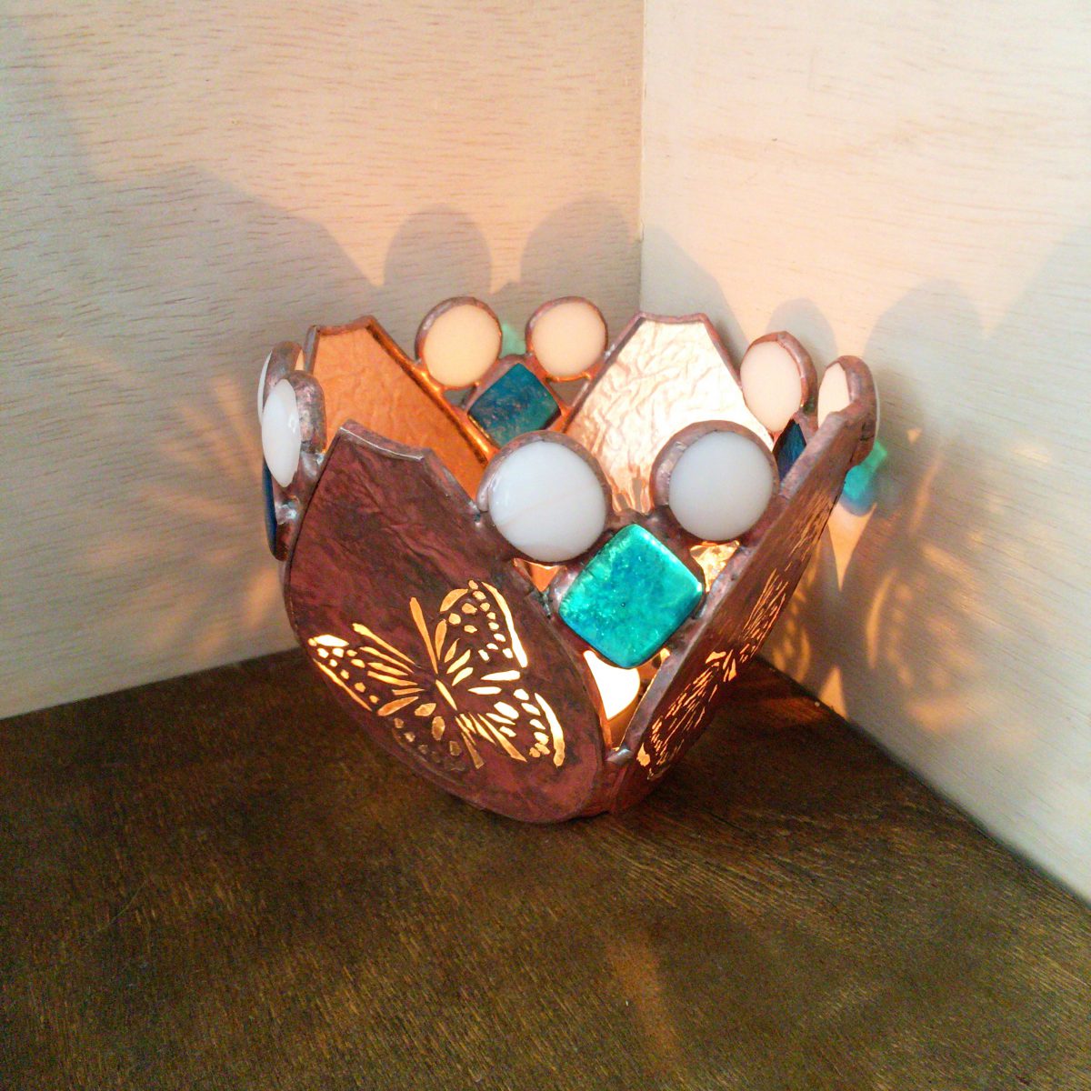 2019年4月19日 / 最終更新日時 : 2019年4月19日 okno その他 生徒さんの作品。ステンドグラスのキャンドルホルダー 生徒さんの作品。キャンドルホルダーです。 コッパーシートに蝶の絵柄を切り抜いて、透かし彫りのようでとても綺麗です! 壁に映る模様の素敵です!