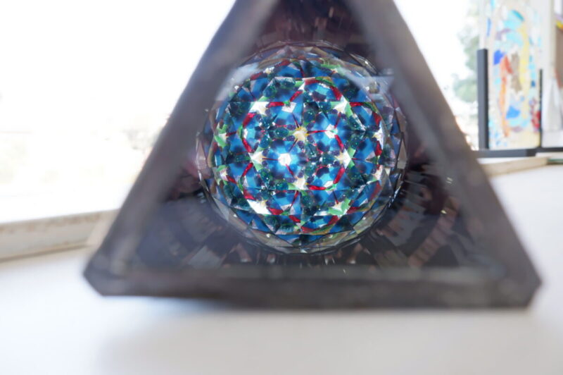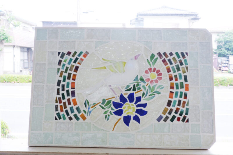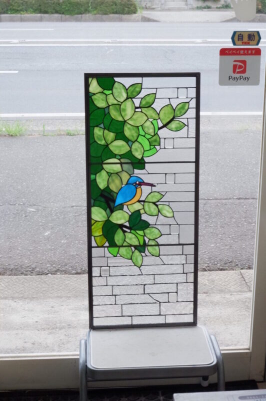 生徒さんの作品。カワセミのステンドグラスパネル(ご自宅に施工)