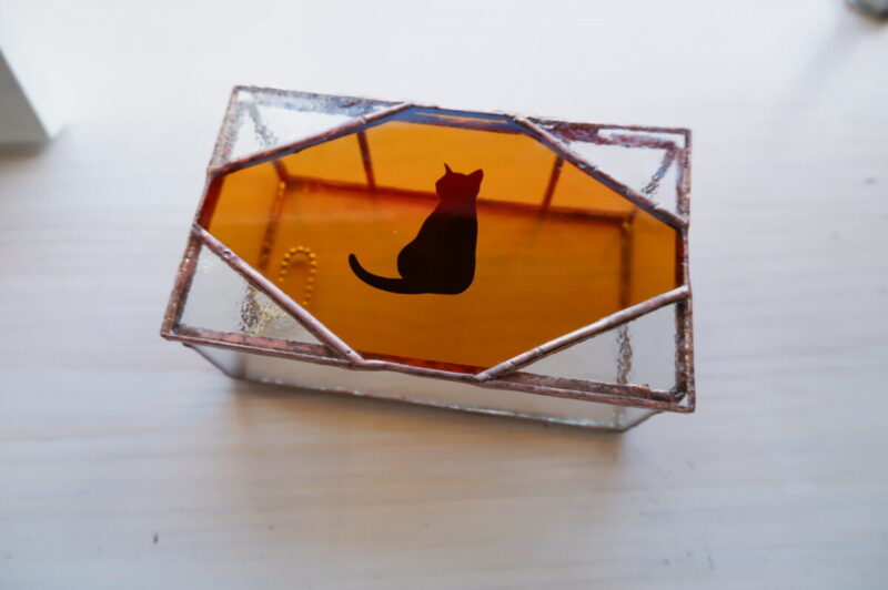 生徒さんの作品。ステンドグラスの猫の小物入れ