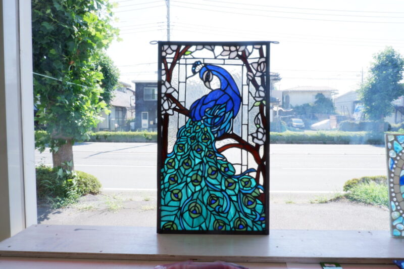 生徒さんの作品。ステンドグラスの孔雀のパネル