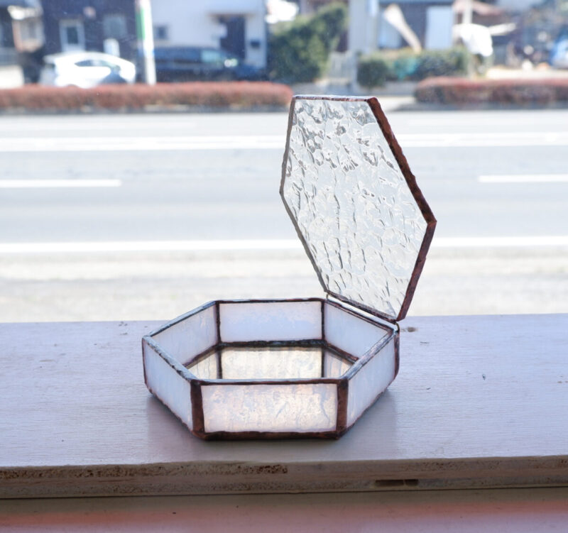 生徒さんの作品。ステンドグラスのフタ付き小物入れ