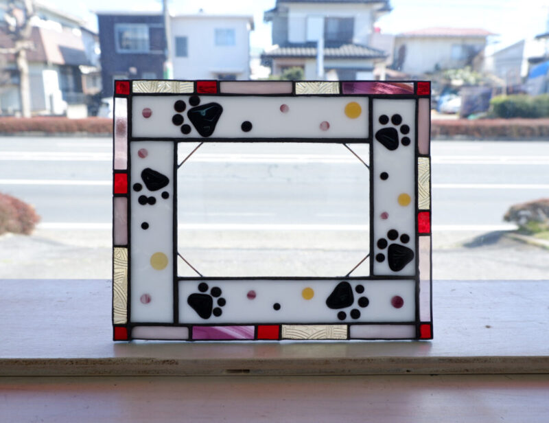 生徒さんの作品。ステンドグラスの足跡の写真たて