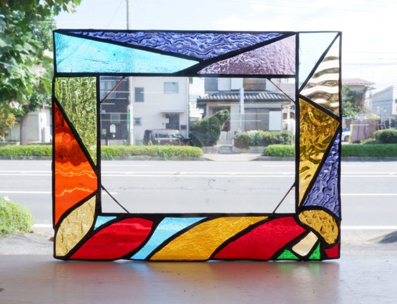 生徒さんの作品。かぼちゃのステンドグラスパネル(木枠)