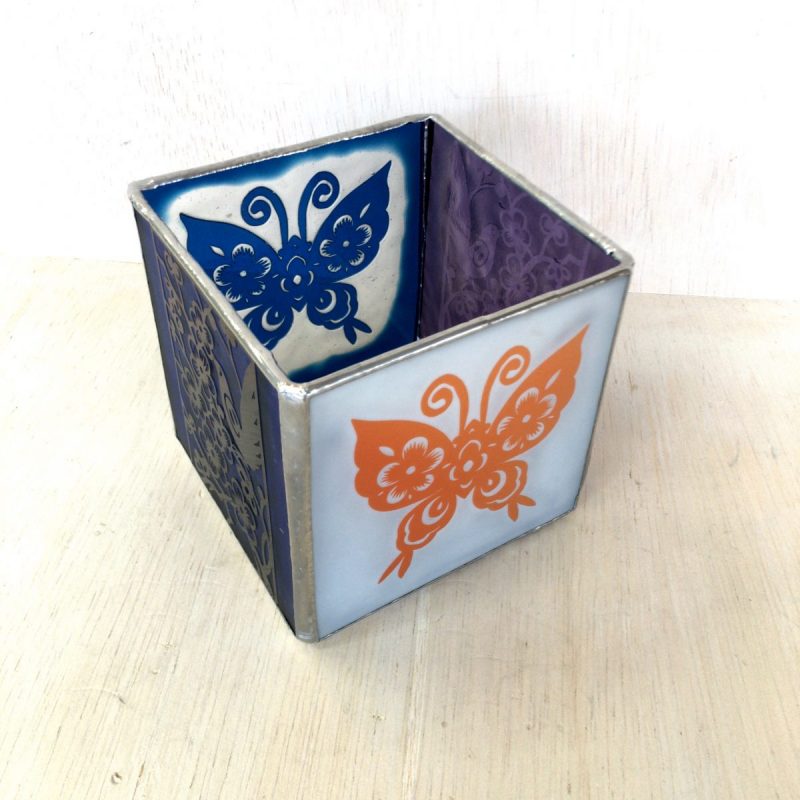 生徒さんの作品。被せガラスにサンドブラストした小物入れ
