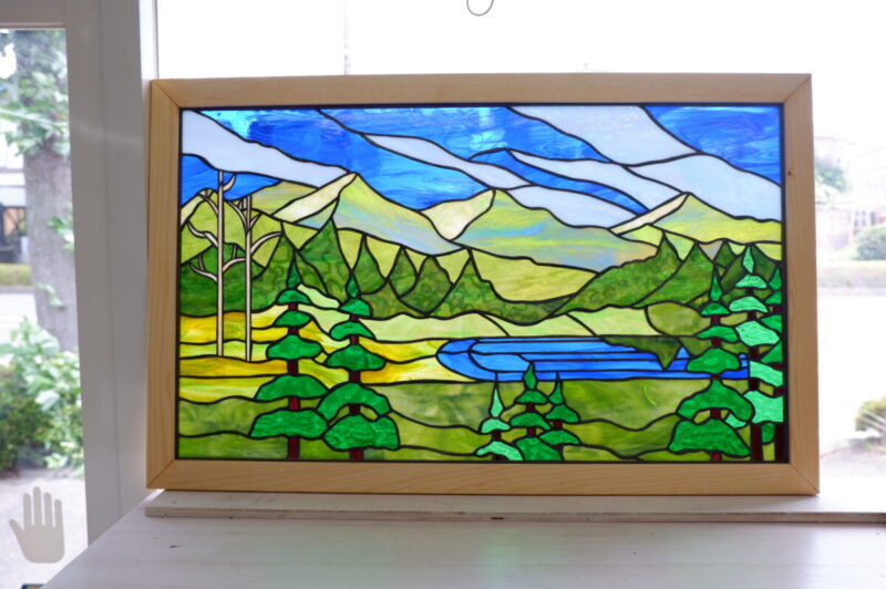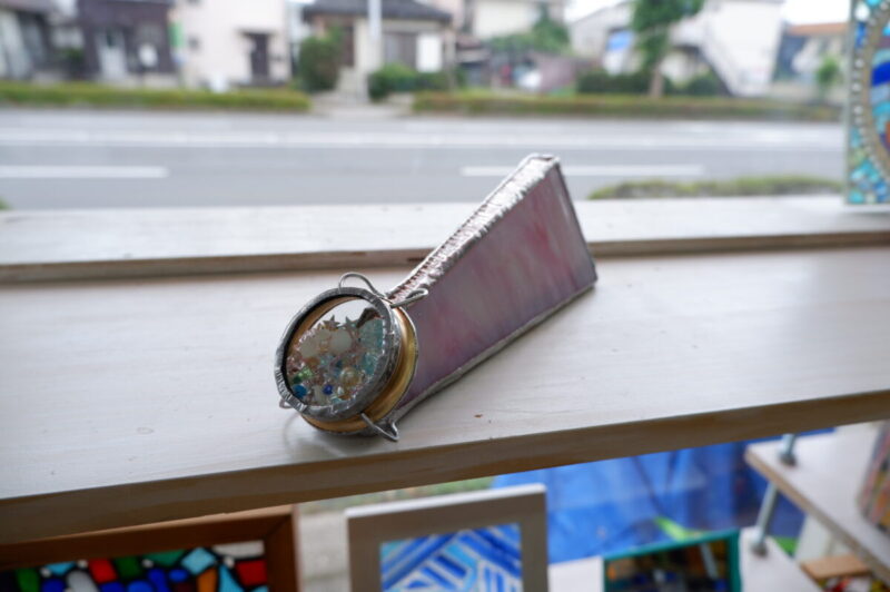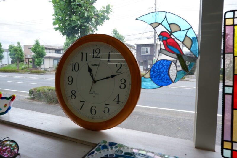 生徒さんの作品。時計にくっつけたステンドグラスの鳥の装飾
