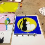2012年11月26日 / 最終更新日時 : 2018年5月3日 okno パネル 猫と月 ご注文の猫のステンドグラスです。 ガラス切り終わりました~(^-^) これから銅のテープを巻いて半田します。 透かしたときが楽しみです♫